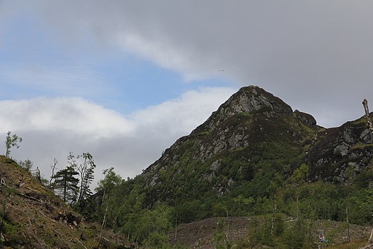 Beinn a’ Chroin (Munro) is a surprisingly rocky little mountain to the south of Crianlarich. The location of the true summit has been the subject of controversy; that with the largest cairn was regarded as the top for many years, but the higher, Munro summit is actually that further west along the ridge.