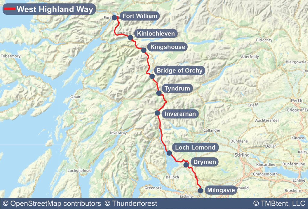 West Highland Way the West Highland Way stretches 96 miles (154 Km) from Milngavie to Fort William, taking in a huge variety of scenery along the way, from countryside parks to loch-shores and open moorlands to steep mountains.